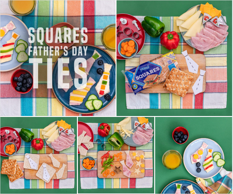 Create a tie template by drawing a tie onto a piece of paper. Use your Squares to size the tie, and cut out the shape. Then, cut the Squares in to ties using the template. Then it’s time to get creative. Using shape cutters for some small circles for polka dot peppers or and ham stars. You could also do some strips of pepper or cheese.