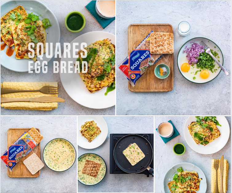 Whisk together onion, green chili, turmeric, salt, coriander and milk in a wide bowl (big enough to fit the Squares). Add in the eggs and whisk for a minute. Dip one slice of bread in the egg mixture and gently press down with a fork so the bread can absorb the egg mix. Flip the bread over and repeat on the other side.
