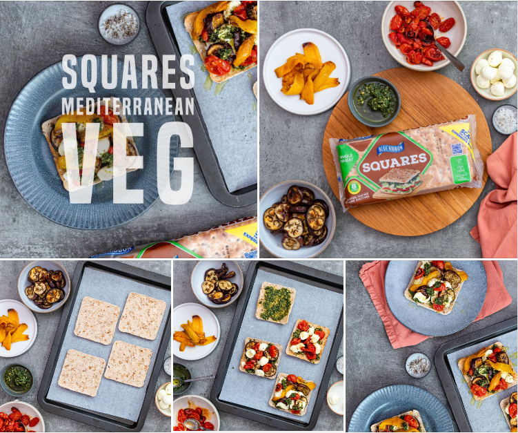 Once your veggies are baked, open your Squares and toast each side. Once toasted, place on a large cutting board and spread with basil pesto. Then, layer the red pepper and yellow pepper slices together with the mozzarella balls. Finish off with a little basil pesto if there’s any left. Serve immediately and enjoy!